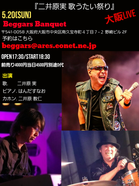 過去のLive2018 2018年5月20日(日)『二井原実 歌うたい祭り』大阪 Author 仮谷克之 Date 2018年4月13日 急遽参加決定!! チケット料金 前売:¥4,500 / 当日:¥5,000 別途ドリンク代 OPEN / 17:30 START / 18:30 Beggars Banquet...
